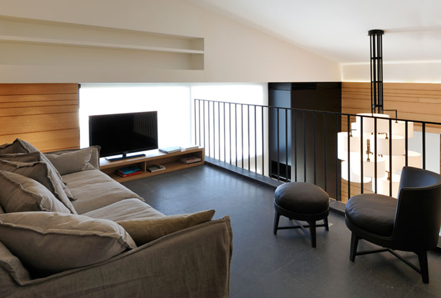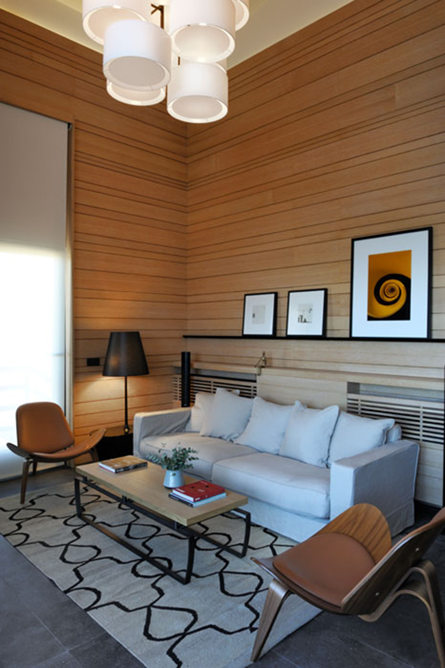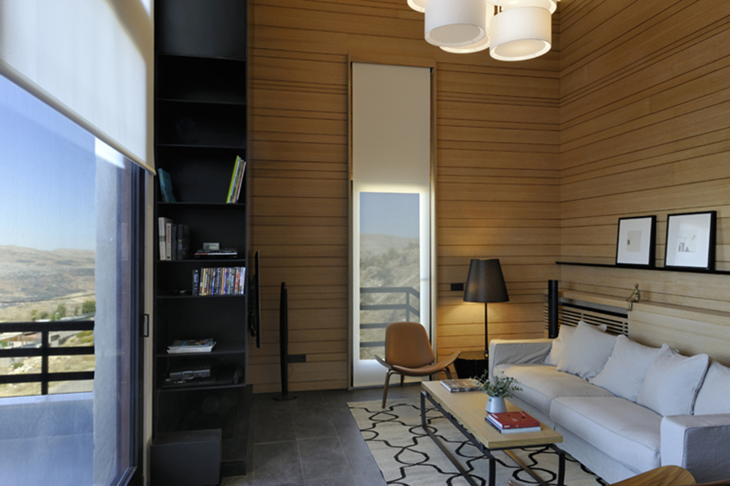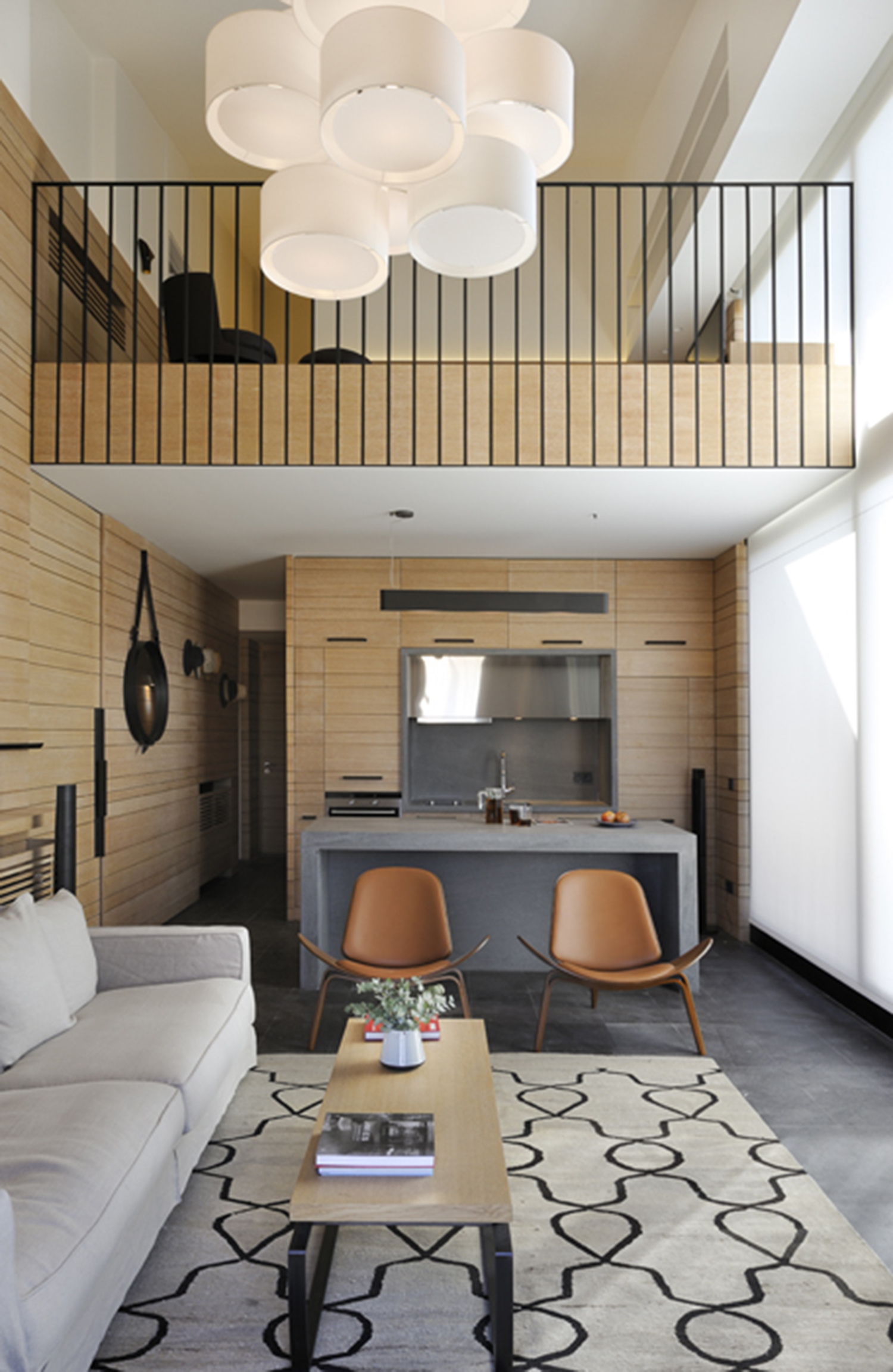 In this curated Duplex in Mount Lebanon, French oak wood becomes a multi-purpose marvel. A sliding door, shelves, hooks, and radiators seamlessly merge with the natural beauty of the wood, transforming the wall cladding into a functional piece. The wood extends its reach to embrace the kitchen cabinets and balustrade in the mezzanine. The black iron chimney ascends to become a sculptural element that draws the eye upward. The concrete kitchen island offers a spacious and versatile workspace for meal preparation, casual dining, and entertaining. The selected wallpaper in the bedrooms becomes the backdrop of this intimate retreat, instantly infusing the space with warmth and character. Toilets are made of exquisite mosaics and marble stone.